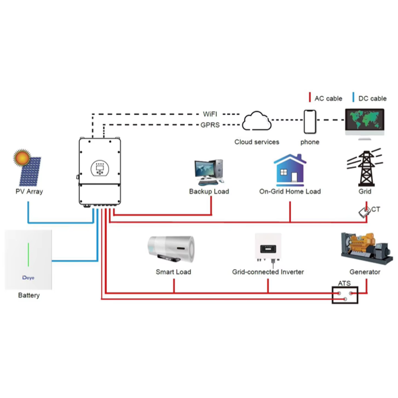 The right picture shows the basic application of this battery. To form a complete operating system, the following devices are requireded: 1.A generator or utility grid 2.PV modules 3.A low-voltage hybrid inverter (for charging and discharging)