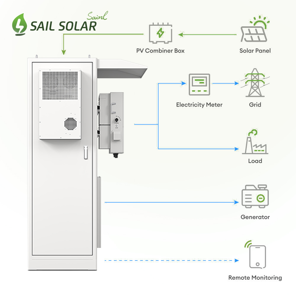 Sail Solar 20-50kw+100kwh all in one outdoor cabinet is a customized modular that integrates a high-performance 20-50kw hybrid inverter, 100kwh advanced lithium iron phosphate batteries, a battery management system(BMS), a power distribution unit(PUD) and environment control system in one elegant weatherproof outdoor unit, simplifying installation, saving space, and streamlining solar management. This plug-and-play solution is especially suitable for off-grid solar systems, areas without grid access, remote regions, and harsh environmets.